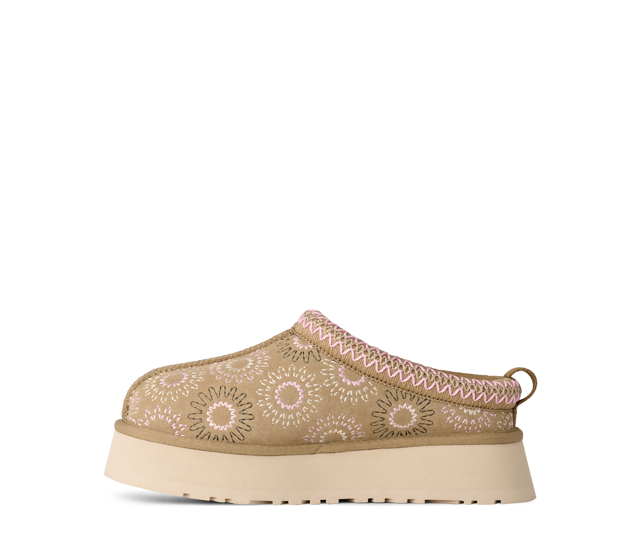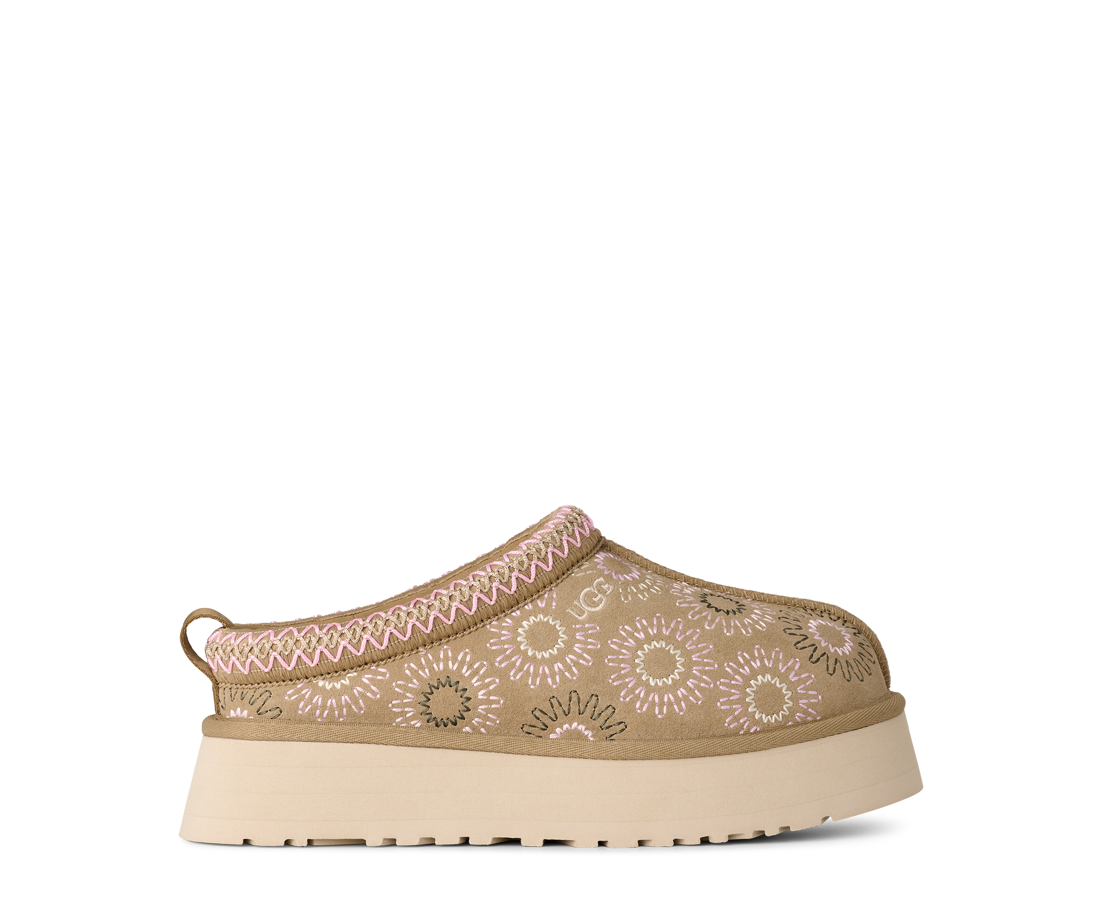 In a sunshine state of mind. Our Tazz Sun Stitch takes the essential elements of your favorite Tazz II platform slip-on and adds our Sun Logo Shape with all-over embroidery across the suede upper. Featuring a lightweight sugarcane EVA outsole, our 100% recycled UGGbraid trim, and a plush sheepskin lining, it fits in as well at home as it does finding fun in the sun.